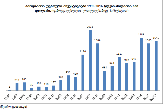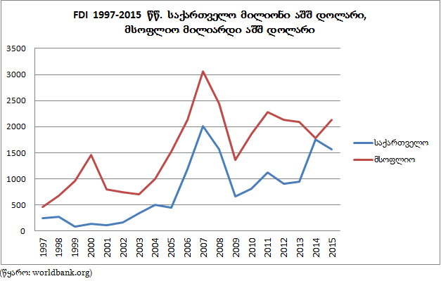 როგორც გრაფიკიდან ჩანს, 1996 წლის მონაცემი იმდენად მცირეა, რომ შეგვიძლია საერთოდ ვუგულებელყოთ და ათვლა 1997 წლიდან დავიწყოთ. 2016 წლის მონაცემი წინასწარია და ის შეიძლება მნიშვნელოვნად შეიცვალოს, რისი გამოცდილებაც გვაქვს წინა წლების მაგალითზე დაყრდნობით. 2016 წლის წინასწარი მაჩვენებელი 22%-ით აღემატება 2015 წლის წინასწარ მაჩვენებელს და მხოლოდ 5%-ით დაზუსტებულს. 20 წლის მანძილზე სულ შემოვიდა 16.47$ მილიარდი. წელიწადში საშუალოდ 823.3$ მილიონი. მხოლოდ რიცხვები არაფერს ნიშნავს. პირობითად 5$ მილიარდი ინვესტიცია საქართველოსთვის იქნება ეკონომიკური ბუმის და მისი ონიშნა ზრდის საფუძველი, ხოლო იგივე რიცხვი ჩინეთისთვის კრიზისის აღმნიშვნელი. ამიტომ საჭიროა ინვესტიციების მშპს-თან ფარდობის გამოყენება. მსოფლიო ბანკის ანგარიშით საქართველოს მშპ მიმდინარე ფასებში იმავე წლებში შეადგენდა შემდეგს: