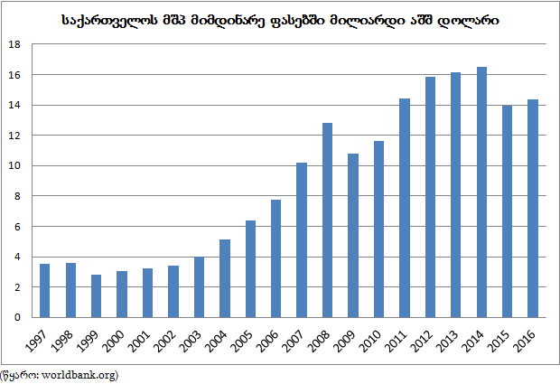 შენიშვნა-2016 წლის მაჩვენებელი აღებულია საქსტატის წინაწარი მონაცმეის-2.7%-იან ზრდაზე დაყრდნობით. 1999 და 2015 წლებში კლება გამოწვეულია ვალუტის გაუფასურებით, ხოლო 2009 წელს როგორც ვალუტის გაუფასურებით, ასევე ეკონომიკის შემცირებით ლარებში.
