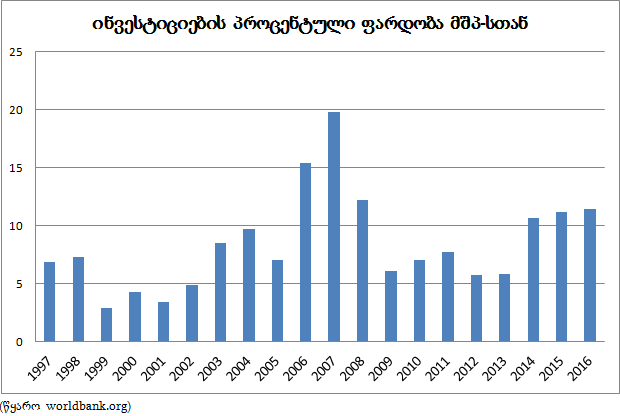 ზემოთ მოყვანილი მშპ-ს და ინვესტიციების მონაცემების შეჯერებით ნათელი ხდება, რომ 2007 წელს განხორციელებული ინვესტიცია 2.015$ მილიარდი რეკორდული იყო არა მხოლოდ რაოდენობრივად პროცენტული თანაფარდობითაც-19.81%. ესაა ერთ-ერთი მიზეზი რის გამოც ამ წელს დაფიქსირდა რეკორდული ეკონომიკური ზრდა-12.3%. მიუხედავად იმისა, რომ 2014 წელს შემოვიდა 568$ მილიონით მეტი ინვესტიცია 2006 წელთან შედარებით, პროცენტული თანაფარდობამ 2006 წელს შეადგინა 15.37%, 2014 წელს კი მხოლოდ 10.65%. 2017 წელს დაგეგმილია 4%-იანი ეკონომიკური ზრდა, 10 წლის წინანდელი რეკორდის გასამეორებლად ახლა უკვე დაგვჭირდება არა 2.015 არამედ 2.955 მილიარდი აშშ დოლარის ინვესტიცია, რაც დღევანდელი გადმოსახედიდან ნაკლებად დამაჯერებელია, თუმცა სავსებით შესაძლებელი უახლოეს წლებში.