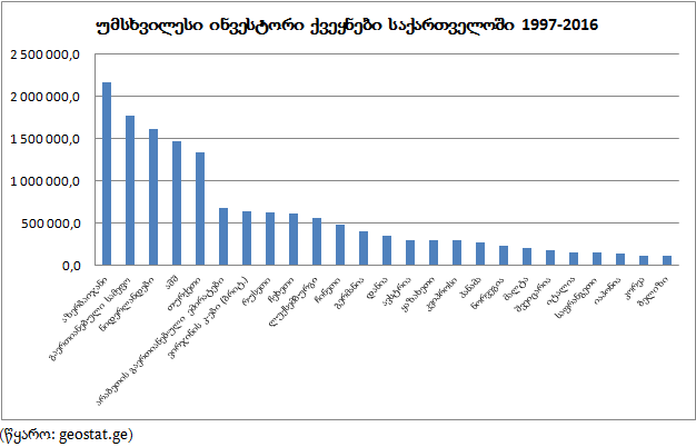მნიშვნელოვანია იმ ქვეყნების, ქვეყანათა ჯგუფის თუ საერთაშორისო ორგანიზაციების გამოვლენა რომელიც ახორციელებს ინვესტიციებს საქართველოში. როგორც გასულ წელს, ასევე მთელი გასული 20 წლის მანძილზე ლიდერია აზერბაიჯანი. იმ ქვეყნების სია, კი რომლებმაც განახორციელეს 100 მილიონი დოლარის და უფრო მეტის ინვესტიცია ბოლო 20 წლის მანძილზე ასე გამოიყურება:
