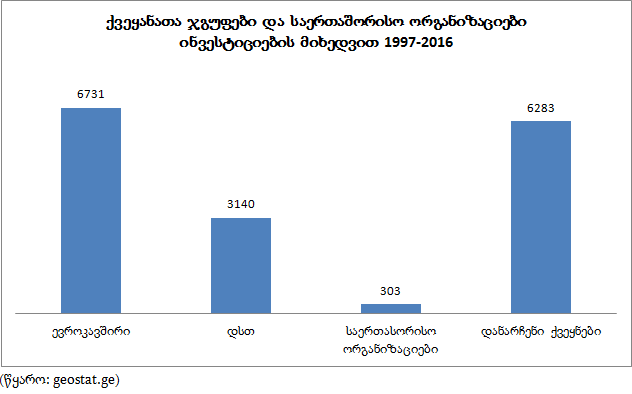 აზერბაიჯანის პირველობა ძირითადად გამოწვეულია ნავთობსადენებისა და გაზსადენის გათვალისწინებით. ნავთობსადენების გაყვანაში აქტიურ მონაწილეობას იღებდა ბრიტანეთი, კერძოდ კი კომპანია BP. ვირჯინიის კუნძულების ყოფნა მე-7 ადგილზე გამოწვეულია ოფშორული ზონებით. კორეას ინვესტიციების ნახევარზე მეტი-61 მილიონი განხორციელებული აქვს 2015-2016 წლებში, ნენსკრაჰესის მშენებლობა 2015 წელს დაიწყო და მას კორეული კომპანია K water აშენებს. საგულისხმოა ის გარემოებაც, რომ ევროკავშირის ქვეყნების მიერ განხორციელებული ინვესტიციების წილი დსთ-ს ქვეყნებისას 2.14-ჯერ აღემატება.