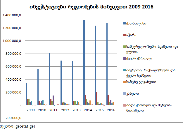 საიდუმლოს არ წარმოადგენს ის ფაქტი, რომ საქართველოში რეგიონები თბილისთან შედარებით კიდევ უფრო ნაკლებადაა განვითარებული. ინვესტიციების განაწილება ამ ფაქტს კიდევ ნათლად წარმოაჩენს. საქსტატი ინვესტიციებს რეგიონების მიხედვით 2009 წლიდან აღრიცხავს 8 წლის განმავლობაში თბილისში განხორციელდა ინვესტიციების 73.6%, რაც 1 ქალაქისთვის, თუნდაც ის იყოს დედაქალაქი, ძალიან მაღალი მაჩვენებელია. უფრო კონკრეტულად კი ინვესტიციები რეგიონების მიხედვით ასე ნაწილდება:
