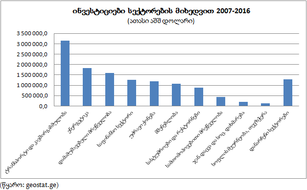 დოლარებში გამოხატულ რაოდენობას, პროცენტულ თანაფარდობას, რეგიონულ განაწილებასა და სახელმწიფოებთან ერთად, ინვესტიციებზე საუბრისას, აუცილებლად დასაზუსტებელია სფეროები რომელშიც ხორციელდება ინვესტიცია. ამის შესახებ საქსტატზე ინფორმაცია 2007 წლიდან მოიპოვება.