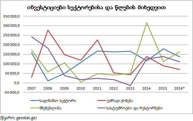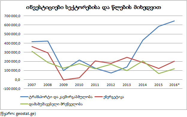 მნიშვნელოვანია ასევე ტენდენციების წარმოჩენა, წლების მიხედვით რომელ სექტორში იზრდება და რომელში მცირდება ინვესტიციის მოცულობა. ქვემოთ 2 გრაფიკს ძირითადად ტეხილის სახე აქვს და რაიმე გამოკვეთილი მიმართულების შესახებ არ გვაძლევს ინფორმაციას. ტრანსპორტისა და კავშირგაბმულობის მკვეთრი ზრდა გამოწვეულია შაჰ-დენიზის პროექტით და მისი დაჩქარებით. 2 წელიწადში პროექტი დასრულდება და თუ არ დაიწყო რაიმე ახალი, აღნიშნულ სექტორში გვექნება ასევე მკვეთრი ვარდნა. 2014 წელს მშენებლობის ზრდა გამოწვეული იყო, ძირითადად ოლიმპიური ქალაქის მშენებლობით.