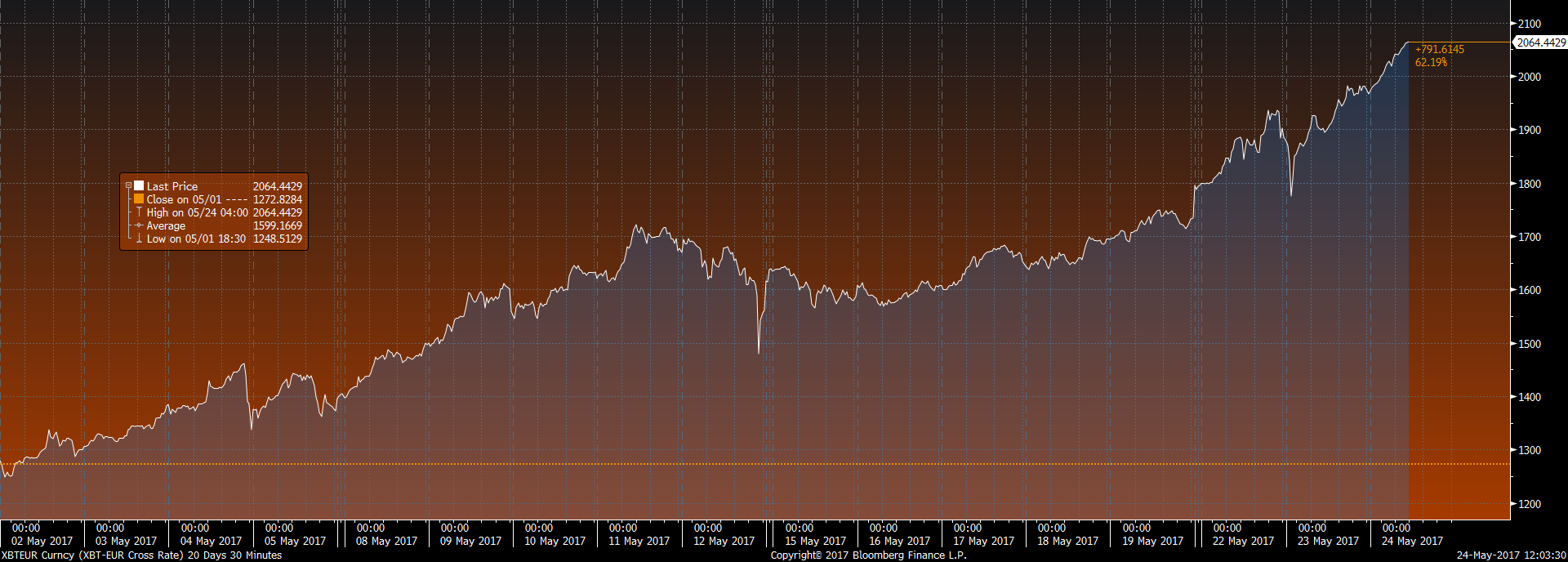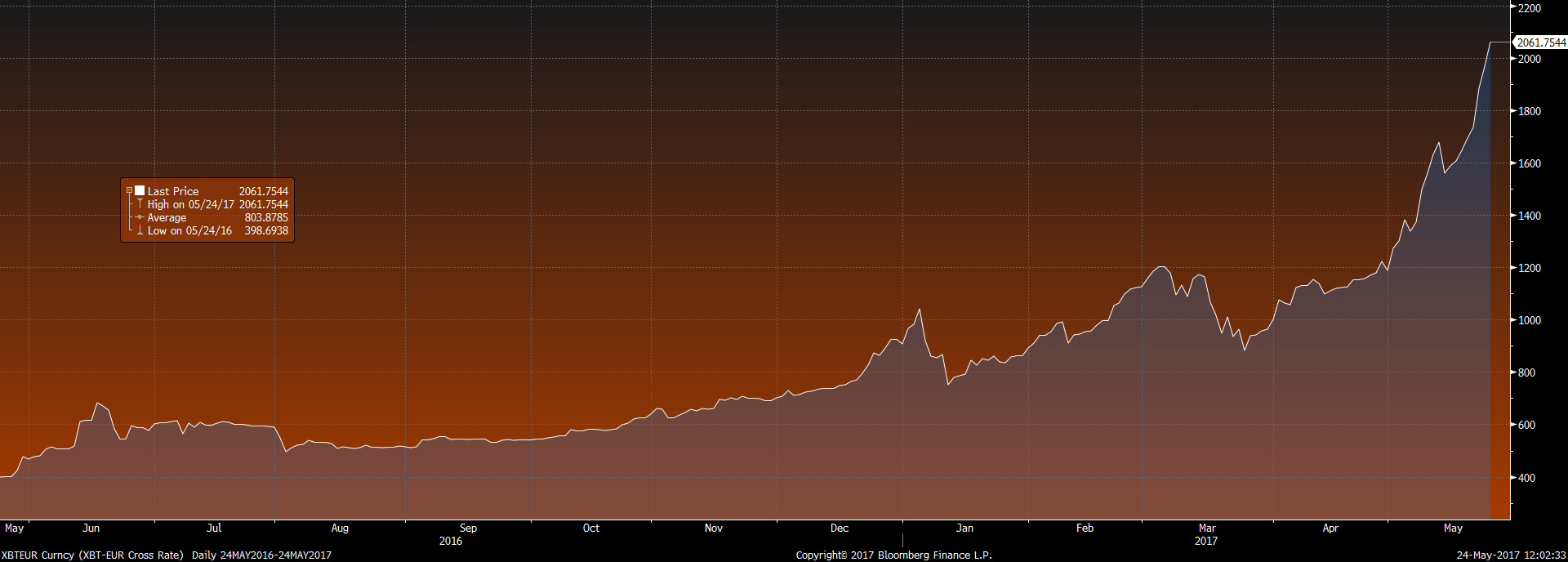 გრაფიკებიდან კარგად ჩანს, რომ თუ 2013 წლის 14 ოქტომბერს 1 ბითქოინის ფასი 84 ევროს შეადგენდა, ახლა ეს მაჩვენებელი, დაახლოებით, 2063 ევროა.