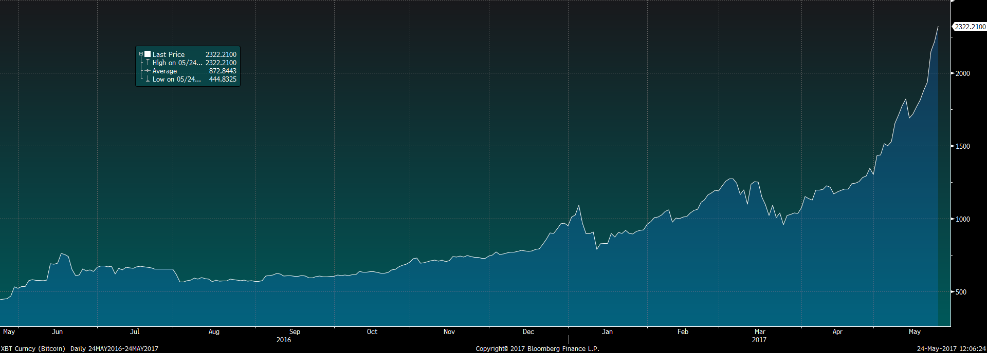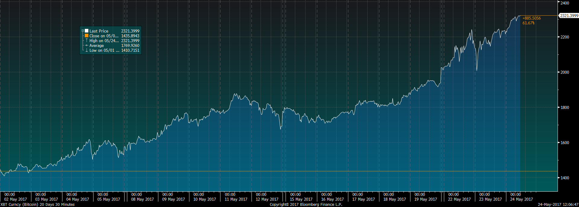 ქვემოთ მოცემულია ბითქოინების კურსის გრაფიკული ანალიზი Bloomberg-ის ტერმინალების მიხედვით.