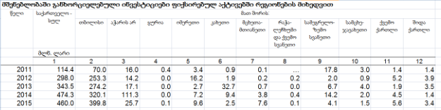 გრაფიკიდან ნათლად ჩანს, რომ 2011-2015 წლებში მშენებლობის სექტორში ინვესტირების თვალსაზრისით, ძირითადად, ზრდა შეინიშნება. რეგიონების მიხედვით არათანაბარი სიტუაციაა. ზოგიერთ შემთხვევაში ფიქსირდება ზრდა, ზოგიერთში -კლება, და არის ასევე წლები, როდესაც ორივე ტენდენცია შეინიშნება.