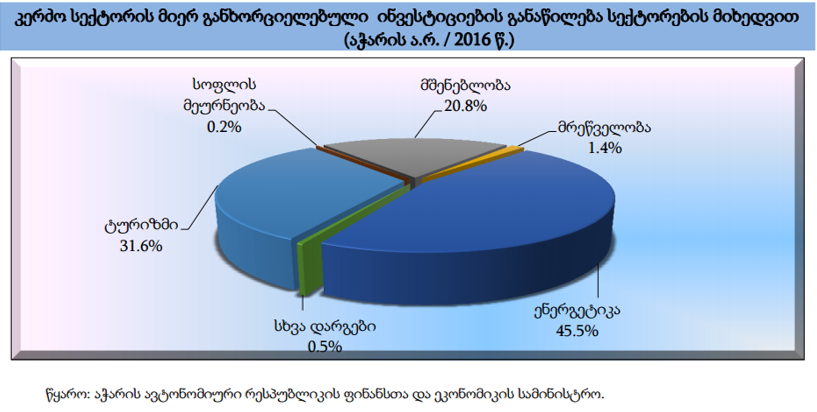 ახლა კი ვნახოთ რა სიტუაციაა ერთ კონკრეტულ რეგიონში. 2016 წელს აჭარაში კერძო სექტორის მიერ განხორციელებული ინვესტიციები ეკონომიკის სექტორების მიხედვით შემდეგნაირად ნაწილდება: ენერგეტიკა – 45.5%, ტურიზმი – 31.6%,მშენებლობა – 20.8%, სოფლის მეურნეობა – 0.2%, მრეწველობა – 1.4%, სხვა სექტორები – 0.5%.