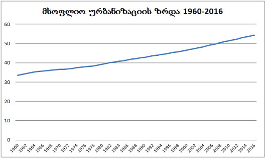 ჯერ კიდევ 1 საუკუნის წინ მსოფლიო მოსახლეობის მხოლოდ 12-13 პროცენტი ცხოვრობდა ქალაქში. 1960 წლისთვის 33%. 50%-იან ზღვარს კი ამ საუკუნეში 2008 წელს გადააჭარბა ჩვენთან რომ ომი მძვინვარებდა და გარეთ კრიზისი აი მაშინ. დღეს 54%-ს შეადგენს. თითქმის ყველა განვითარებულ ქვეყანაში კი 75%-ზე მეტი.