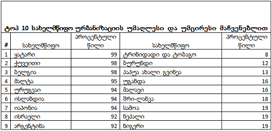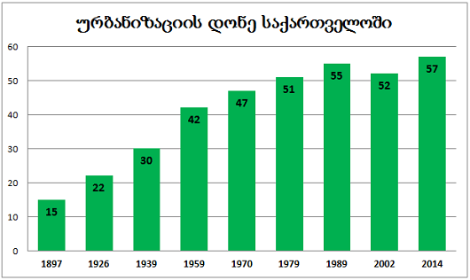 ამჟამად საქართველოში, ურბანიზაციის დონე სოლ მცირედით აღემატება მსოფლიო საშუალოს, თუმცა 1990 წელს 1.3-ჯერ მეტიც ფიქსირდებოდა. 90-იანების ნგრევისა და რეცესიის კვალი ამ კომპონენტსაც დააჩნდა. გასათვალისწინებელია ისიც, რომ პატარა ქალაქებში მოსახლეობის ნაწილი სოფლის მეურნეობას მისდევს და სინამდვილეში ის უფრო დიდი სოფელია, თუმცა ქალაქად აღირიცხება.