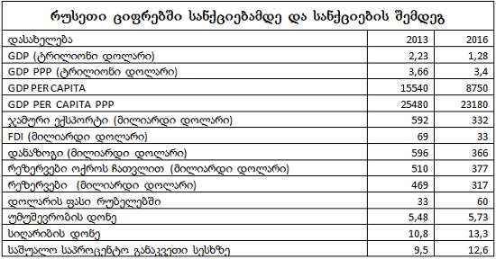 მაგრამ „გაზპრომით“ არც იწყება და არც მთავრდება ყველაფერი. რაც არ უნდა იყოს რუსეთი დიდი ბაზარია 140 მილიონი მაცხოვრებლით და 1.28$ ტრილიონიანი ეკონომიკით PPP დათვლით 3.4$ ტრილიონით. სანქციებითა და ვაჭრობის შეზღუდვით რუსეთთან ერთად ზარალდება ევროპაც. ევროპული კომპანიები და მასში დასაქმებული პირები. გარდა ამისა რუსეთში მრავლადაა დასავლური კომპანიების საწარმოები, ოფისები საპასუხო სანქციებისას ზარალდებიან ისინიც. მეტ-ნაკლებად სერიოზული სანქციები რუსეთს 2014 წლიდან დაუწესეს. მშპ-ს ზრდა ჯერ 0.7%-მდე დაეცა იმავე წელს, 2015-ში დაიკლო 2.8%-ით, ხოლო 2016 წელს კიდევ 0.2%-ით. ამავე პერიოდში ნავთობის ღირებულება 107$-დან 49$-მდე შემცირდა. 2016 წლის იანვარში 30$-საც ჩამოსცდა, ზუსტად მაშინ დოლარის ღირებულებამ 80 რუბლს გადააჭარბა, სავალუტო ჯიხურებში 90-საც. ასეთი დრამატული კლება არ გამოუწვევია მხოლოდ ჩინეთის მოხმარების შემცირებას და გლობალური ეკონომიკის ზრდის ტემპის კლებას მას თან ერთვოდა ირანისთვის სანქციების შერბილება და აშშ-ს მიერ ნედლი ნავთობის ექსპორტზე აკრძალვის გაუქმება. რომ არა ოპეკის შეთანხმებული მოქმედებები ფასი შესაძლოა 40 ან 35 დოლარზე დაბალი ყოფილიყო ისევ, რაც კიდევ უფრო მძიმე დღეში ჩააგდებდა რუსეთს. 1986 წელს ნავთობის ფასი 27$-დან 14$-მდე დაეცა და 1990 წლამდე 17$-ს არც ასცდენია. მაშინდელი 14$ ამჟამინდელ 31$-ს უტოლდება. ასეთმა კლებამ დააჩქარა სსრკ-ს დანგრევა. 1998 წელს ფასი 19-დან 12 დოლარამდე დაეცა დღევანდელი 18$ რამაც ასევე დააჩქარა რუსეთის დეფოლტი. ალბათ ყველას გვსმენია ის წუწუნი რუსეთისთვის დაწესებულმა სანქციებმა ჩვენც გვაზარალა გადმორიცხვები შემცირდაო. ექსპორტი შემცირდაო 2015-16 წლებში, ინვესტიციები შემცირდაო… ეს ყველაფერი კარგი, მაგრამ როცა რუსეთის ეკონომიკა 7-8 პროცენტით იზრდებოდა წელიწადში, დოლარი 23 რუბლი ღირდა და ნავთობი 140$ აი ზუსტად მაშინ განახორციელა მეზობელმა ინტერვენცია. რამაც დამატებითი ტერიტორიების ოკუპაციისა და მსხვერპლის გარდა ძალიან სერიოზული ეკონომიკური პრობლემები მოგვიტანა. ბევრად ბევრად მეტი ვიდრე შემცირებული გადმორიცხვები.
