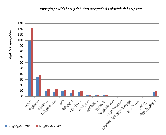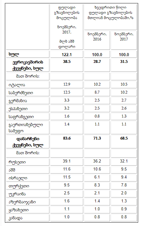 2017 წლის ნოემბერში საქართველოდან საზღვარგარეთ 19.9 მლნ აშშ დოლარი (53.1 მლნ ლარი) გადაიგზავნა, ნაცვლად 17.1 მლნ აშშ დოლარისა (42.3 მლნ ლარისა) გასული წლის ნოემბერში.