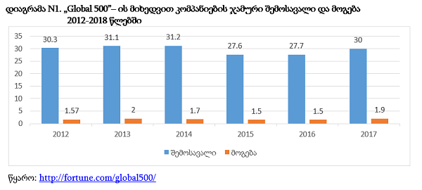 2012-2018 წლებში რეიტინგებში არსებული მონაცემების ანალიზი იძლევა შემდეგი დასკვნების გამოტანის საშუალებას: 2014 წელს მსოფლიოს 500-მა უდიდესმა კომპანიამ, მიიღო შემოსავალი 31.2 ტრილიონი დოლარი, რაც უმნიშვნელოდ მეტია 2013 წელთან შედარებით, თუმცა მიღებული მოგება შემცირდა 15 %-ით და შეადგინა 1.7 ტრილიონი დოლარი. 2015 და 2016 წლებში 2013 წელთან შედარებით მონაცემები არსებითად შეიცვალა, ჯამური შემოსავალი შემცირდა დაახლოებით 11%-ით და შეადგინა 27.7 ტრილიონი დოლარი, ხოლო მოგება შემცირდა 25%-ით და გახდა 1.5 ტრილიონი. ფაქტობრივად, შემოსავალიც და მოგებაც ჩამოცდა მსოფლიო ფინანსური კრიზისის დროს არსებულ მონაცემებს (შემოსავალი შემცირდა 9%-ით, მოგება 4.5%-ით). მიუხედავად იმისა, რომ 2017 წლის ჯამური შემოსავლები და მოგება წინა წელთან შედარებით გაიზარდა, ის ვერ აცდა 2013 წლის მაჩვენებლებს (იხ. დიაგრამა N1). ამდენად, 2014 წლის სტატიაში ოპტიმისტური მოლოდინები რეალურად არ გამართლდა. შესაბამისად, უმნიშვნელოდ გაზრდილი შემოსავლების არგუმენტად მოყვანა იმის აღსანიშნავად, რომ გლობალური ბიზნესი დაბრუნდა და ეკონომიკური კრიზისი დაძლეულია ნაადრევი გამოდგა.