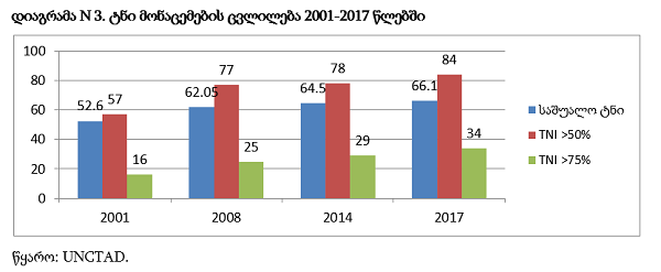 ამგვარად, დიკენის დასკვნით ტნი-ს მონაცემები ქმნიან მხოლოდ მცირე მტკიცებულებას მულტინაციონალურ კომპანიათა მიერ საკუთარი აქტივების, გაყიდვებისა და დასაქმების დამოკიდებულების დონეზე საკუთარი ქვეყნის გარეთ. აღნიშნულის განხორციელებას, კი მხოლოდ ჰიპერგლობალიზაციის პირობებში შეიძლება მოველოდეთ****. თუმცა, „UNCTAD“-ის მიერ გამოქვეყნებული 100 წამყვანი არასაფინანსო კორპორაციის ცხრილის ანალიზი ცხადყოფს, რომ კომპანიების დაინტერესება გლობალური ბაზრის მიმართ 2001-2017 წლებში დინამიურად და სტაბილურად იზრდებოდა. 2017 წლის მონაცემებით ტრანსნაციონალიზაციის საშუალო მაჩვენებელმა შეადგინა – 66.1%, რაც 13.5%-ით მეტია 2001 წლის მონაცემებთან შედარებით. 100-დან 84 კომპანიის ტნი 50%-ზე მეტია, ხოლო 34 კომპანიის ცდება 75 %-იან მაჩვენებელს (იხ. დიაგრამა N3).