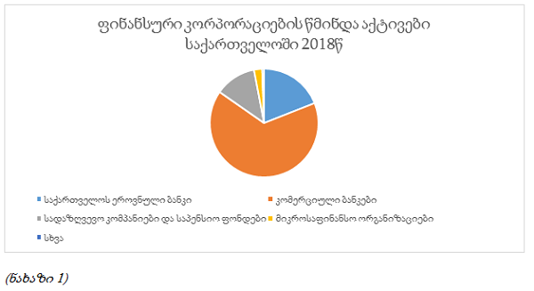 საქართველოს ფინანსურ ბაზარზე არსებული სურათის უკეთესად აღსაქმელად საქართველოს სტატისტიკის სამსახურის მონაცემები დაგვეხმარება. 2019 წლის მაისის მდგომარეობით საქართველოში 15 კომერციული ბანკი მოქმედებს (134 ფილიალით და 801 სერვის-ცენტრით), მათი სააქციო კაპიტალის სიდიდე კი 5.2 მლრდ. ლარამდე მერყეობს. საქართველოს ფინანსურ ბაზარზე მოქმედებს 2 არასაბანკო სადეპოზიტო დაწესებულება, 56 მიკროსაფინანსო ორგანიზაცია, 908 ვალუტის გადამცვლელი პუნქტი, 2 საფონდო ბირჟა, 17 სადაზღვევო კომპანია და 3 საპენსიო ფონდი. თუმცა, აქტივების მოცულობის მიხედვით კომერციული ბანკების დომინანტური პოზიცია სრულიად ნათელია. საქართველოს ფინანსურ ბაზარზე ფინანსურ კორპორაციათა აქტივების წილი ქვემოთაა მოცემული. (ნახაზი 1)