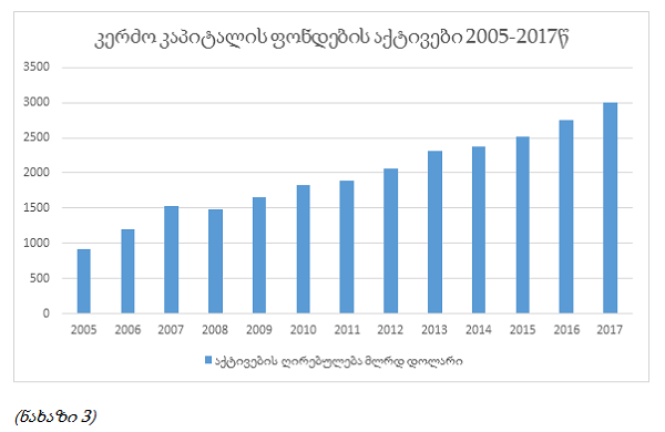 რაც შეეხება კერძო კაპიტალის ფონდებში არსებული აქტივების მოცულობას, ის წლების განმავლობაში სტაბილურად და საკმაოდ მაღალი ტემპით იზრდებოდა. 2005 წლის $917 მილიარდიდან 2017 წელს $3 ტრილიონს მიაღწია და 12 წლის განმავლობაში საშუალო წლიურმა ზრდის ტემპმა 11% შეადგინა. (ნახაზი 3)