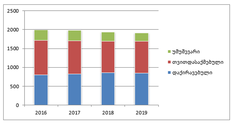 2016 წელთან შედარებით 2019 წელს დასაქმებულთა რაოდენობა 27 ათასით არის გაზრდილი, რაც 4-წლიანი პერიოდისთვის საკმაოდ დაბალი მაჩვენებელია. თუმცა, თუ ვნახავთ რეალურად, ანუ დაქირავებით დასაქმებულებს, მათი რაოდენობა 48 ათასით არის გაზრდილი, ხოლო თვითდასაქმებულების რაოდენობა 69 ათასით არის შემცირებული. უმუშევართა რაოდენობა 58 ათასით არის შემცირებული, ანუ მაღალი ალბათობით, უმუშევართა ნაწილმა მუშაობა კი არ დაიწყო, სამსახურის ძებნას თავი დაანება, სამუშაო ძალიდან გავიდა.