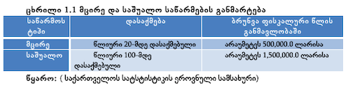 მცირე და საშუალო საწარმოების განმარტება ეფუძნება საწარმოთა ბრუნვის მოცულობას და დასაქმებულთა რაოდენობას და გამოიყენება ბიზნესის შესახებ ოფიციალური სტატისტიკის მომზადების მიზნით. საშუალოა საწარმო, რომელშიც წლიურად დასაქმებულია რაოდენობა მერყეობს 20-დან 100 დასაქმებულამდე და რომლის წლიური ბრუნვა არ აღემატება 1,5 მლნ. ლარს. მცირეა საწარმო, რომელშიც წლიურად დასაქმებულთა რაოდენობა არ აღემატება 20-მდე დასაქმებულს და რომლის წლიური ბრუნვა არ აღემატება 500 ათას ლარს (SME Development Strategy of Georgia, 2015)