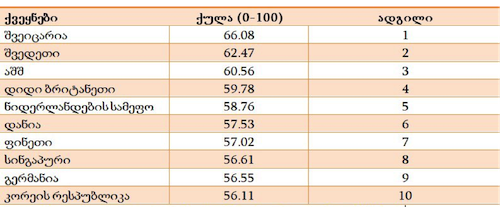 საქართველო საშუალოზე მაღალი ქულებით შეფასდა 7-იდან 2 კატეგორიაში, კერძოდ ინსტიტუტები და საბაზრო გარემო, ხოლო საშუალოზე დაბალი მაჩვენებლები გამოავლინა დანარჩენ 5 კატეგორიაში.