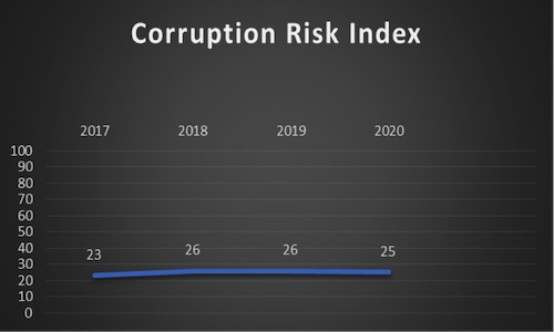 ყოველწლიურად, საერთაშორისო ორგანიზაცია „საერთაშორისო გამჭვირვალობა“ აქვეყნებს კორუფციის აღმქის ინდექსს. ჯერ-ჯერობით 2021 წლის მაჩვენებელი არ გამოქვეყნებულა, აქედან გამომდინარე ვისაუბრებთ 2020 წლის მაჩვენებელზე. „საერთაშორისო გამჭვირვალობამ“ გამოაქვეყნა ანგარიში, რომელშიც შეფასებულია საჯარო სექტორში კორუფციის დონე მსოფლიოს 180 ქვეყანასა და ტერიტორიაზე.