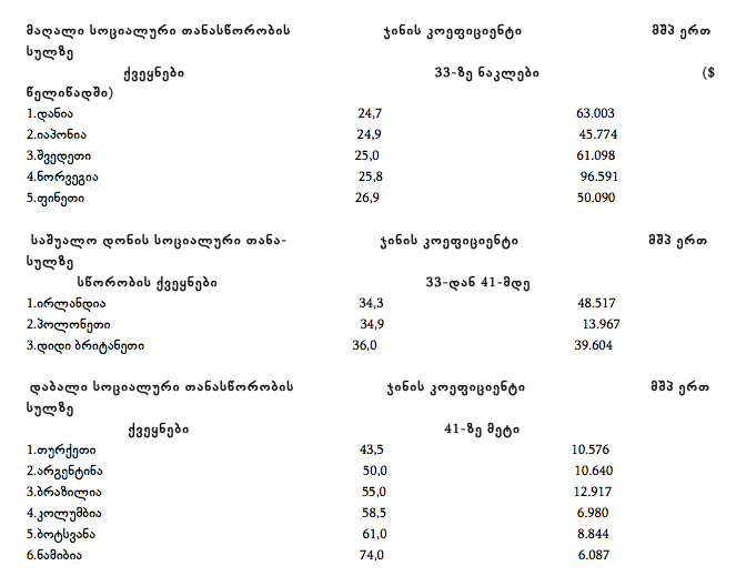 მით უფრო მაღალია ამ ქვეყნის სოციალური თანასწორობის ხარისხი (ანუ, დაბალია ჯინის