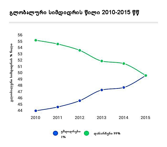 ეს მიუხედავად იმისა, რომ მსოფლიოს მოსახლეობა 400 მილიონი ადამიანით გაიზრდა. სხვაგვარად რომ ვთქვათ, პლანეტის მოსახლეობის უმდიდრესი 1% ამჟამად ფლობს მსოფლიო ქონების 50%-ს, ყველაზე მდიდარი 50% კი ფლობს 99%-ზე მეტს, რაც იმას ნიშნავს, რომ უღარიბესი მოსახლეობის ქონების წილი მსოფლიოს მთლიან სიმდიდრეში 1%-ზე ნაკლებია.
