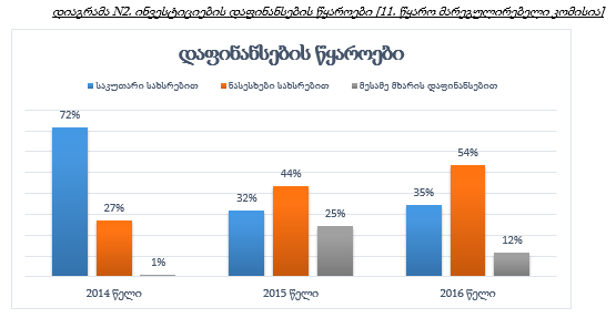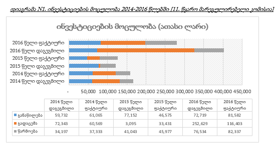 დიაგრამაზე №1 გამოსახულია 2014-2016 წლებში ფაქტობრივად განხორციელებული ინვესტიციების მოცულობები საქმიანობების მიხედვით და შედარებულია შესაბამის წლებში მის დაგეგმილ მაჩვენებლებთან. ყველაზე დიდი ოდენობით ინვესტიცია რეგულირებად კომპანიებში განხორციელდა 2016 წელს (280 322 ათასი ლარი), მაგრამ ამავე წელს დაგეგმილთან შედარებით შესრულდა მხოლოდ – 70% (2015 წელი – 104%, 2014 წელი – 96%) (13).