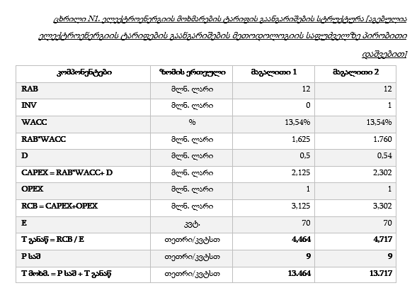 ელექტროენერგიის ტარიფის გაანგარიშების სიმულაციურმა მოდელმა გვიჩვენა, რომ ყოველი დამატებითი 1 მლნ ლარის ინვესტიცია პირობითი დაშვებების შემთხვევაში, იწვევს ტარიფის გაზრდას 1.88%-ით. მაგრამ გასათვალისწინებელია, რომ თუ რეგულირებადი აქტივების ბაზა დიდია და ინვესტიცია პროცენტულად ნაკლები, ტარიფზე გავლენაც შედარებით ნაკლებია და პირიქით.