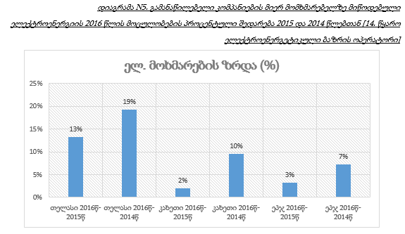 ი მეთოდოლოგიის შესაბამისად ამ ეტაპზე არ გადათვლილა, მაგრამ მოხმარების მცირედი ზრდა არასაყოფაცხოვრებო მომხმარებლების მიერ მოხმარებული ელექტროენერგიის მოცულობის ზრდამ გამოიწვია (ხოლო საყოფაცხოვრებო მოსახლეობის მოხმარების კლება გამოიწვია მოსახლეობის გამრიცხველიანებამ და აღრიცხვის მოწესრიგებამ). გამანაწილებელ კომპანიებში 2012-2016 წლებში მოხმარება საშუალოდ გაიზარდა 3%-ით, ხოლო 2016 წელს წინა წელთან შედარებით – 6%-ით (14).