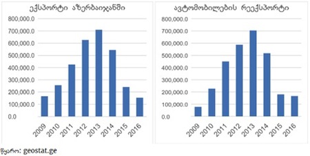 ეს ორი გრაფიკი ზემოთ ძალიან კი ჰგავს ერთმანეთს, მაგრამ მაინც სხვადასხვაა, პირველი ექსპორტს ასახავს აზერბაიჯანში 2009-2016 წლებში მეორე კი ავტომობილების რეექსპორტს იმავე პერიოდში. დასტური იმისა, თუ რა შეიძლება მოხდეს როცა 1 ქვეყანასა და 1 პროდუქტზე დამოკიდებულება მაღალია. თუნდაც ის 1 ქვეყანა მოკავშირე იყოს.
