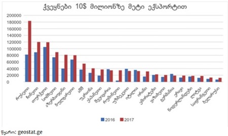 რაღაც ტიპის სავაჭრო ურთიერთობა საქართველოს ისეთ ქვეყნებთანაც კი აქვს როგორებიცაა გვატემალა და უგანდა. მაგრამ ის ქვეყნები, რომელთანაც პირველ 6 თვეში 10$ მილიონზე მეტი ექსპორტი განხორციელდა შემდეგია: