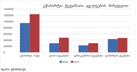 მთლიანი ექსპორტი საერთო ჯამში გაიზარდა, მაგრამ სხვადასხვა ქვეყანაში სხვადასხვა მასშტაბით. ქვეყნის ჯგუფების მიხედვით ყველაზე დიდი ზრდა აღინიშნა დსთ-ში-61.2% ძირითადად რუსეთის, უკრაინისა და აზერბაიჯანის ხარჯზე, ზრდა იყო ევროკავშირშიც-30.4% და სხვა ქვეყნებშიც.