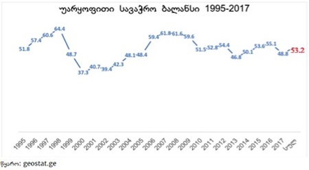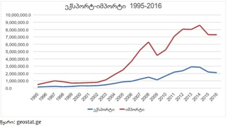1995 წლიდან მოყოლებული 2017 წლის ივლისამდე სულ 26 მილიარდის საქონელი გავყიდეთ და 86 მილიარდის ვიყიდეთ. არ ითვლება 2004 წლამდე არსებული ან თუნდაც შემდგომი პერიოდის კონტრაბანდული პროდუქცია, არც C ჰეპატიტის სამკურნალო საშუალებები, პრინციპში ეს არც უნდა ითვლებოდეს. თავის მხრივ რადგან ექსპორტი არ იბეგრება, ქვეყნიდან პროდუქციის გატანაზე არ არის იმ სახის კონტროლი, რაც შემოტანაზე ამიტომ რეალური ექსპორტი აღემატება ოფიციალურ მაჩვენებელს. ოფიციალური სტატისტიკა კი მაინც ასეთია: