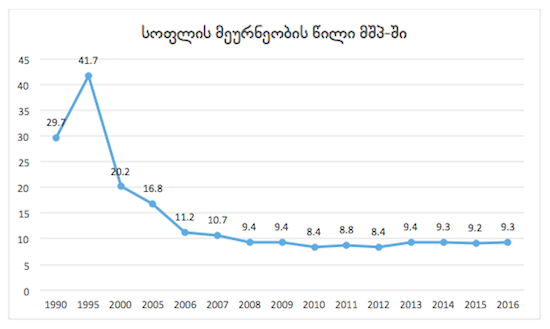 დღეისათვის კი სოფლის მეურნეობის მთავარ სუბიექტებს მცირე ფერმერები წარმოადგენენ. სოფლის მეურნეობის სამინისტროს მონაცემებით ქვეყნის მუშახელის 52% სწორედ სოფლის მეურნეობაშია დასაქმებული(2), თუმცა მათ მიერ შექმნილი დამატებული ღირებულების წილი მთლიან გამოშვებაში, 2016 წლის მონაცემებით, მხოლოდ 9.3%-ს შეადგენს, რაც თავისთავად დარგში არსებულ დიდი პრობლემებზე მიუთითებს. სოფლის მეურნეობის წილი მთლიან შიდა პროდუქტში 1990 წლის შემდეგ დეტალურადაა მოცემული გრაფიკზე. (იხ. ნახაზი1)