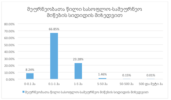 კონკურენტუნარიანობის შესაფასებლად კიდევ ერთი უმნიშვნელოვანესი ფაქტორი მასშტაბის ეკონომიაა, რომელიც სასოფლო-სამეურნეო მიწების მსხვილი ფერმერების ხელში აკუმულირებით და წარმოების დიდი მოცულობით მიიღწევა, რადგან წარმოების მოცულობის ზრდასთან ერთად იკლებს პროდუქტზე საშუალო დანახარჯები. დანახარჯების შემცირება კი ფერმერს კონკურენტულ უპირატესობას ანიჭებს. საქართველოში კი, დამოუკიდებლობის მოპოვების შემდეგ, სასოფლო-სამეურნეო მიწების საოჯახო მეურნეობებზე გადაცემის გამო დღეს მეურნეთა 75% 1ჰა ან ნაკლებ მიწის ნაკვეთს ფლობს (იხ. ნახაზი 2)(6) და საოჯახო მეურნეობათა 83.55% საქმიანობის მთავარ მიზნად საკუთარი მოთხოვნილებების დაკმაყოფილებას მიიჩნევს, რაც აბსოლუტურად გამორიცხავს მათგან მასშტაბის ეკონომიის მიღწევის შესაძლებლობას, რასაც ვერ ვიტყვით ევროპის ქვეყნების მსხვილ და საშუალო ფერმერებზე. თუმცა, საგულისხმოა დადებითი ტენდენცია, რაც ამ კუთხით ბოლო წლებში შეინიშნება. 2013 წლიდან მოქმედებს კანონი სასოფლო-სამეურნეო კოოპერატივების შესახებ, რომლებიც განსაკუთრებული საკრედიტო და საგადასახადო შეღავათებით ისარგებლებენ (7). ამას გამოხმაურება მოყვა მცირე ფერმერთა მხრიდან, თუმცა რეალური შედეგების მისაღებად ბევრად მეტი კოოპერატივის შექმნაა საჭირო.