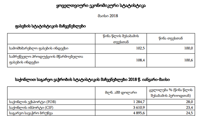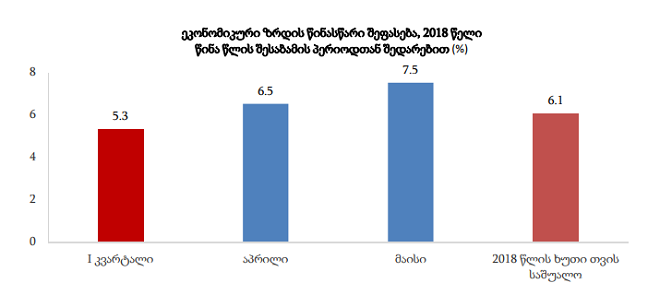 წინასწარი შეფასებით, წინა წლის შესაბამის პერიოდთან შედარებით 2018 წლის მაისში რეალური მთლიანი შიდა პროდუქტის ზრდის ტემპმა 7,5 პროცენტი შეადგინა, ხოლო 2018 წლის პირველი ხუთი თვის საშუალო რეალური ზრდა 6,1 პროცენტი დაფიქსირდა.