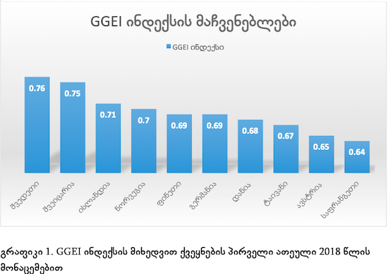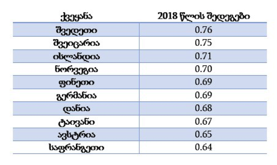 2018 წლის მონაცემებით, საქართველო 130 ქვეყანას შორის 44-ე ადგილს იკავებს (0.52 მაჩვენებლით) და უსწრებს ისეთ ქვეყნებს, როგორიცაა თურქეთი, ესტონეთი, ლატვია, აზერბაიჯანი, უკრაინა და სხვა. ქვეყნების პირველი ათეული კი ასე გამოიყურება: