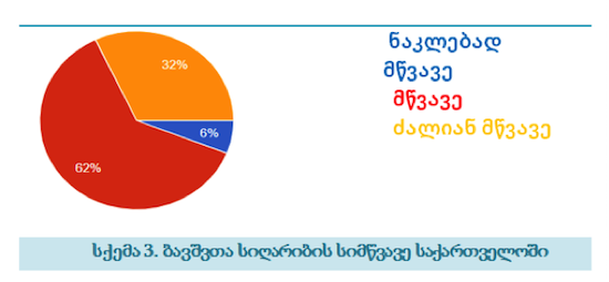 მათგან 62% ს მიაჩნია რომ საქართველოში ბავშვთა სიღარიბე მწვავეა, 32% თვლის რომ ძალიან მწვავეა ხოლო 6% თვის კი სიღარიბის სიმწვავე ნაკლებად იგრძნობა. (სქემა 3)