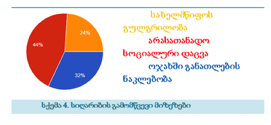 რაც შეეხება სიღარიბის გამომწვევ მიზეზებს საინტერესო იყო რას ფიქრობდნენ ამაზე ჩვენი რესპოდენტები, მათ 32%-ს მიაჩნია რომ სიღარიბის გამომწვევი მიზეზი ოჯახში განა¬თლების ნაკლებობაა, 44% სიღარიბეს არასათანადო სოციალურ დაცვას უკავშირებს, ხოლო 24% სახელმწიფოს გულგრილობას ასახელებს უმთავრეს მიზეზად.(სქემა 4)