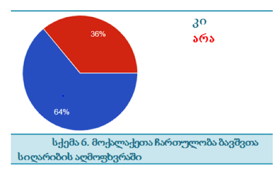 მედია ხშირად აშუქებს ბავშვთა სიღარიბეზე თემებს, რასაც საზოადოების გამოხმაურე¬ბა და დახმარების სურვილი მოჰყვება ხოლმე… ჩვენი რესპოდენტების 64 % ჩართულია იმ ღონისძიებებში რაც ბავშვთა სიღარიბის აღმოფხვრას ემსახურება, 34% -ს კი ამ ღონისძიებებ¬ში მონაწილეობა არ მიუღია. (სქემა 6)