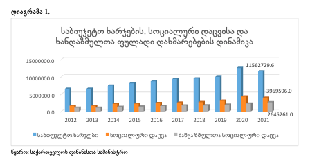 დიაგრამის მიხედვით შეგვიძლია ვთქვათ, რომ 2021 წლის ბიუჯეტში მცირდება როგორც ბიუჯეტური, ისე სოციალური დაცვაზე განსზაღვრული ხარჯები.კერძოდ სოციალურ დაცვაზე მიმართულია 3,9 მლრდ ლარი(ბიუჯეტის ხარჯების 34%) , რაც 2020 წლის შესაბამის მაჩვენებელზე დაახლოებით 335 მლნ ლარით ნაკლებია.მაგრამ იზრდება პენსიებზე გაწეული ხარჯები თითქმის 370 მლნ ლარით, რაც პოზიტიურად შეგვიძლია შევაფასოთ.