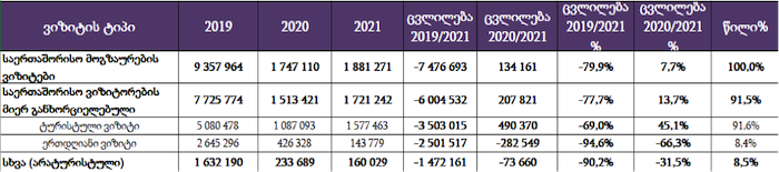 2020 წელს, 2019 წელთან შედარებით, საერთაშორისო მოგზაურების რაოდენობა 81.3%-ით, 9.3 მლნ მოგზაურიდან 1.7 მლნ მოგზაურამდე შემცირდა, მათ შორის, საერთაშორისო ვიზიტორების მიერ განხორციელებული ვიზიტების რაოდენობა 80.4%-ით, 7.7 მლნ საერთაშორისო ვიზიტორიდან 1.5 მლნ მლნ ვიზიტორამდე შემცირდა. უშუალოდ ტურისტული ვიზიტების რიცხვმა 2020 წელს 1 მლნ შეადგინა, როდესაც 2019 წელს, მონაცემი 5 მლნ ტურისტულ ვიზიტს აღწევდა. რაც შეეხება 2021 წელს, 2020 წლის ანალოგიურ მაჩვენებლებთან შედარებით მდგომარეობა გაუმჯობესებულია. კერძოდ, საერთაშორისო მოგზაურობის რაოდენობა გაზრდილია 7.7%-ით(1.7 მლნ მოგზაურიდან 1.8 მლნ მოგზაურამდე), მათ შორის, საერთაშორისო ვიზიტორების მიერ განხორციელებული ვიზიტების რაოდენობა 1.5 მლნ ვიზიტორიდან 1.7 მლნ ვიზიტორამდე, 13.7%-ით გაიზარდა. 2021 წელს ტურისტების რაოდენობა, ანუ იმ ვიზიტორების, რომლებიც საქართველოში 24 საათზე მეტხანს გაჩერდნენ, 45.1%-ით გაიზარდა და 1.6 მილიონი შეადგინა.(იხ.ცხრილი1.)[4]